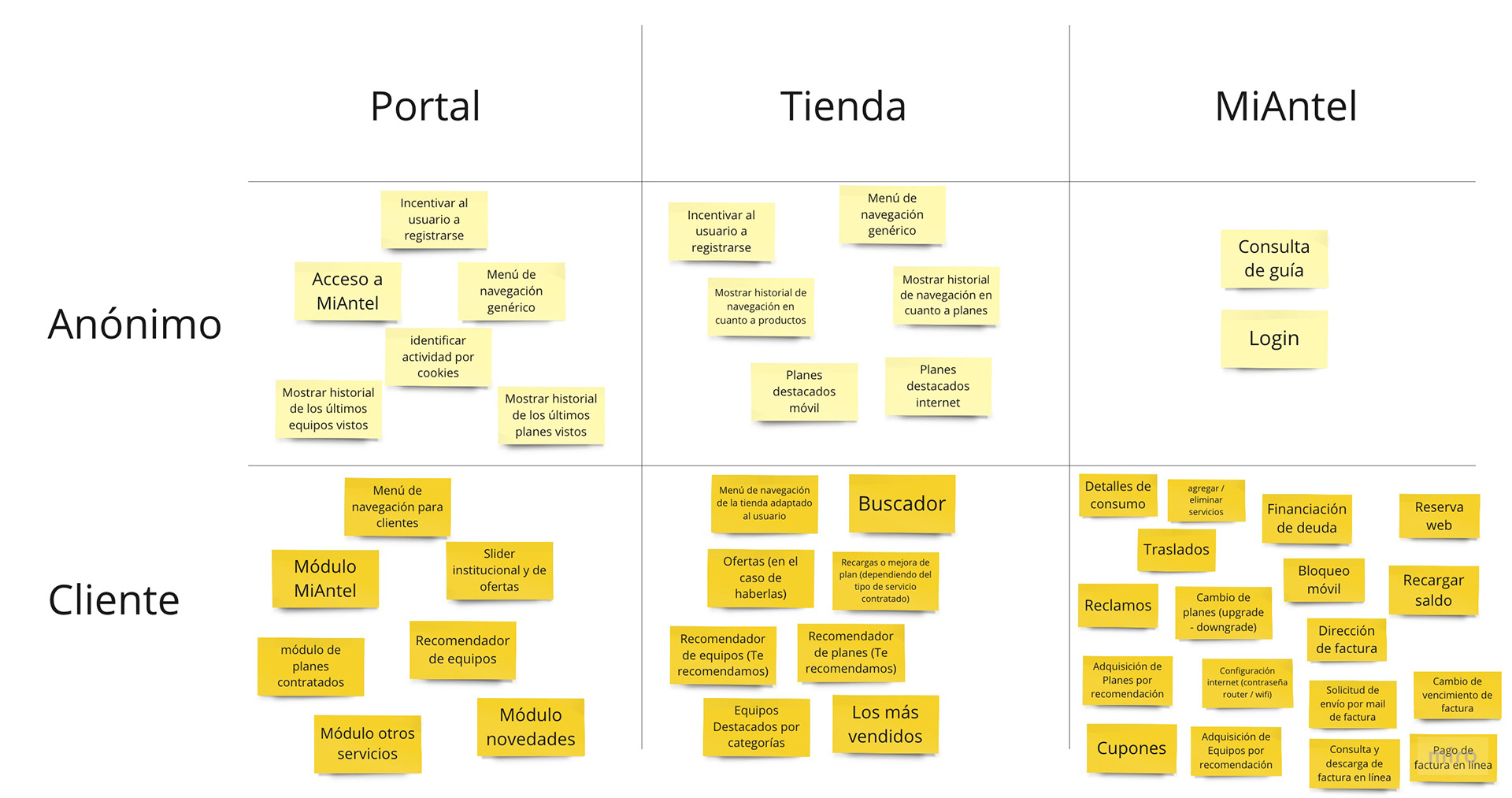 Antel’s digital ecosystem was fragmented into three separate platforms — Portal, Store, and MiAntel — each with different visual styles, user flows, and technologies. The Portal served as the main entry point but lacked a clear purpose, mixing institutional content, promotions, and access to the Store and MiAntel. The Store (tienda.com.uy) handled sales of internet, mobile plans, and devices but operated in isolation, while MiAntel offered self-management tools. Users faced inconsistent navigation and multiple logins — a session in MiAntel wouldn’t carry over to the Store, and vice versa — creating friction and confusion.